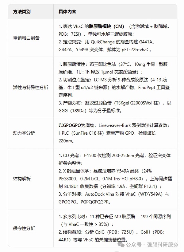 本研究以VhaC为模型,探究 M9 胶原酶 VhaC 的 Y-G 键切割机制,发现 VhaC 的双 G 基序(G441、G442)与Y549构成狭窄的S1'底物结合袋以结合 P1' 底物,其中 Y549 是 P1' 甘氨酸特异性识别的关键——其庞大侧链限制了带侧链残基的容纳。且VhaC Y549 对应的 S1' 酪氨酸在 M9 胶原酶中严格保守,提示其对切割特异性的重要性,为胶原酶的定向改造(如优化胶原寡肽生产)和致病菌抑制剂开发提供了分子依据。