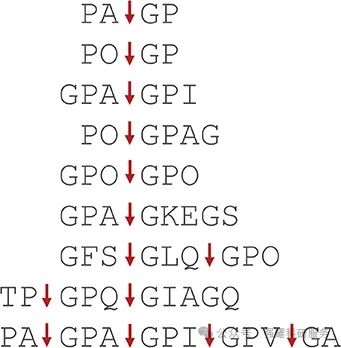 为了研究VhaC对胶原Y−G键的特异性,通过 LC-MS 鉴定重组 VhaC(仅含胶原酶模块 CM)对 9 条牛 I 型胶原来源合成肽的切割产物,明确切割位点。