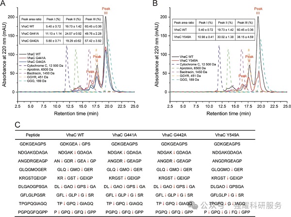 WT、G441A、G442A 的水解产物均含 3 个峰(对应九肽、六肽、三肽,峰 III 为 G-X-Y 三肽),G441A/G442A 的峰 III 面积仅轻微下降(WT 约 60.45%,突变体约 49.76%-57.42%),说明双 G 基序主要影响催化效率,不改变切割特异性;Y549A 的峰 III 面积大幅降至 38.15%,提示三肽产物减少,切割特异性被破坏。