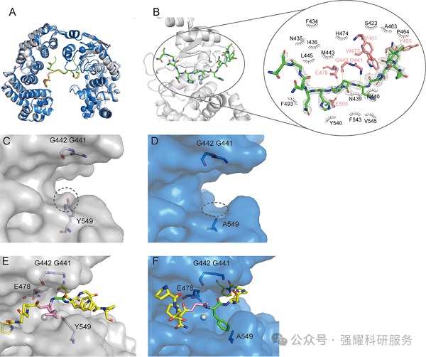 WT 与肽 PGPQGFQGPP 对接时,切割 Y-G 键(P1' 为 G);Y549A 对接时,S1' 口袋容纳 P1' 位的 F,切割位点变为 G-F 键,与图 3C 中 Y549A 切割该肽的实验结果一致。