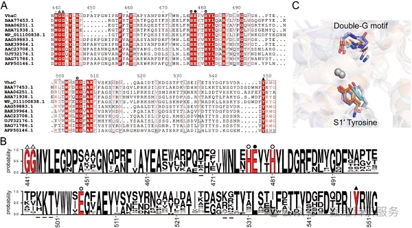 11 个已鉴定的功能性 M9 胶原酶(如 ColG、ColH、Ghcol、VP397)中,与 VhaC G441/G442 同源的双 G 基序、与 Y549 同源的 S1' 酪氨酸严格保守;199 个 M9 胶原酶序列(与 VhaC 同源性 > 35%)的保守图谱进一步确认该保守模式。