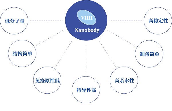 纳米抗体(Nanobody;Nb),即重链单域抗体VHH(variable domain of heavy chain of heavy-chain antibody),无轻链及CH1区。VHH分子量仅为12~15kDa,结构简单。具备免疫原性低、高特异性、良好的水溶性,亲和力优、稳定性强、组织渗透性强以及易于重组表达等特点。凭借这些优势,VHH在生物技术和生物医学领域中的应用范围在迅速扩大。