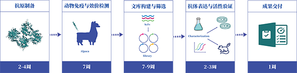 纳米抗体的开发一般通过抗原免疫羊驼,产生靶向特异性纳米抗体。从免疫羊驼血液中提取HCAb的免疫细胞,从免疫效价合格羊驼血液中提取相应免疫细胞,提取细胞的mRNA并进行PCR扩增,获得预设的VHH基因序列。构建噬菌体文库和通过噬菌体展示筛选出候选抗体。候选抗体通过表达纯化后,通过ELISA、FACS、细胞活性实验、亲和力等实验技术进行验证,最终获得合适的纳米抗体。
